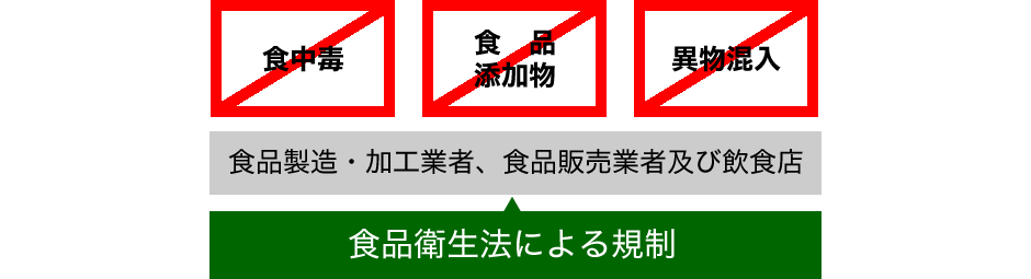 食中毒、食品添加物、異物混入等の食品の安全に関わる規制を食品衛生法が担っています。